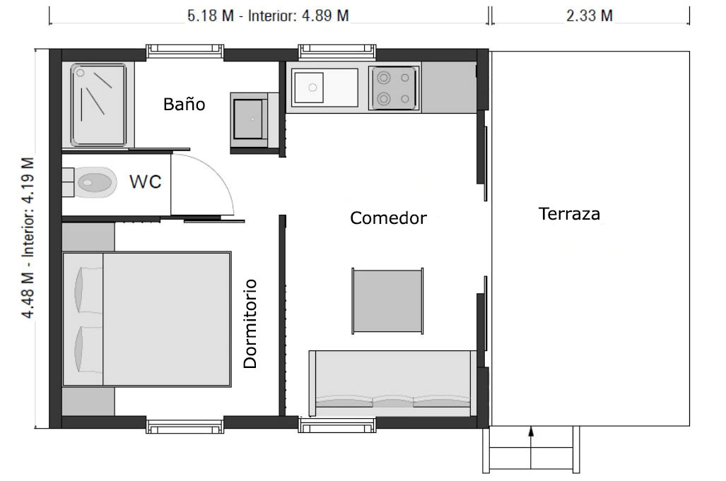 Explora el plano de la cabaña motel de 23 m²: diseño moderno, terraza cubierta y privacidad garantizada.